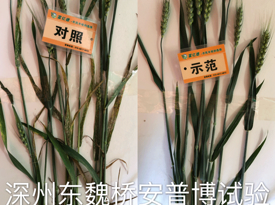 使用效果:示范區,旗葉干凈,無病斑,莖稈粗壯,灌漿飽滿。農戶自防區,發病率80%以上,