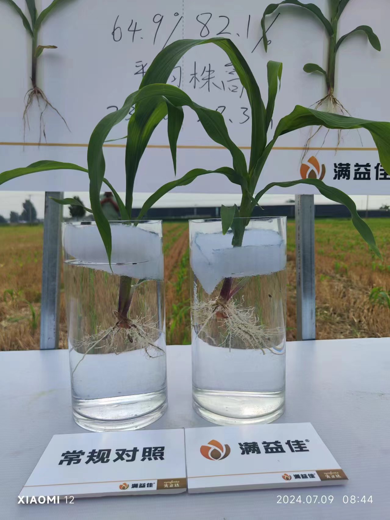 首先我們直觀的可以看到滿益佳包衣示范區(qū)玉米出苗整齊,與對(duì)照相比苗大、苗壯、葉片更濃綠。經(jīng)現(xiàn)場(chǎng)隨機(jī)取樣查看,滿益佳示范區(qū)根系更發(fā)達(dá),毛細(xì)根更多。先正達(dá)李沖老師也現(xiàn)場(chǎng)分享了示范情況及田間調(diào)查數(shù)據(jù)和滿益佳為玉米生長(zhǎng)帶來的卓越效果。經(jīng)調(diào)查,田間出苗率滿益佳示范區(qū)為82.1%,對(duì)照區(qū)為64.9%,示范區(qū)出苗率遠(yuǎn)高于對(duì)照區(qū)。平均株高滿益佳示范區(qū)為28.3厘米,對(duì)照區(qū)為23.6厘米,經(jīng)滿益佳包衣明顯苗子長(zhǎng)得壯長(zhǎng)得大,已經(jīng)覆蓋麥茬,對(duì)照區(qū)相對(duì)瘦弱很多。